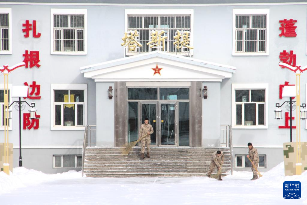 1月12日,边防战士在小白杨哨所清扫积雪。新华社记者 刘红霞 摄