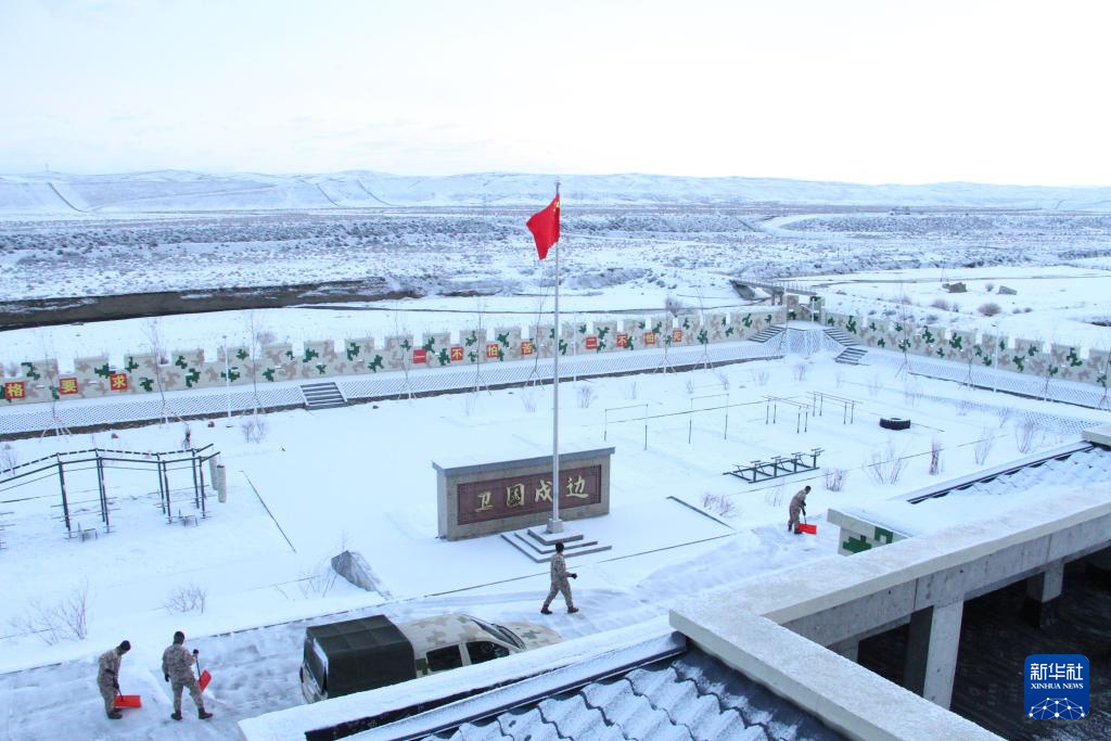 1月11日,边防战士在小白杨哨所清扫积雪。新华社记者 刘红霞 摄