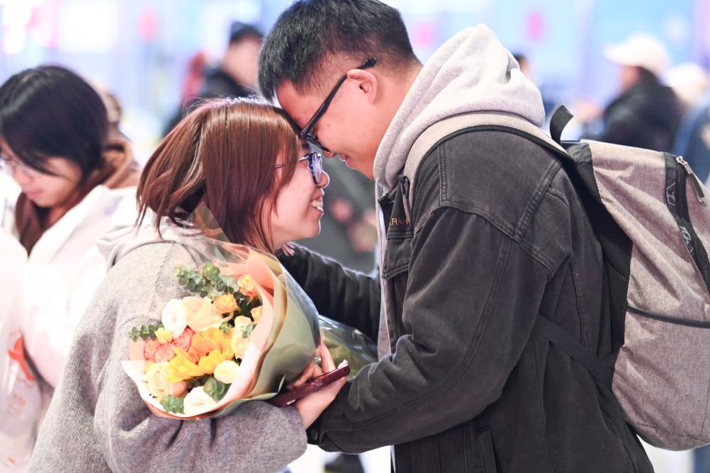 2024年2月5日,在广西柳州站出站口,一名接站者与刚出站的女朋友碰头互动。新华社记者 曹祎铭 摄