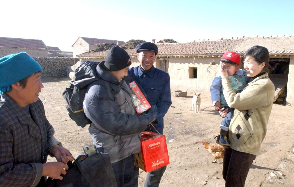 2002年2月10日,外出打工的褚明东(左二)在腊月二十九回到家乡河北省张北县米家沟村,父母、妻女早早地等在家门口。新华社记者 周文广 摄