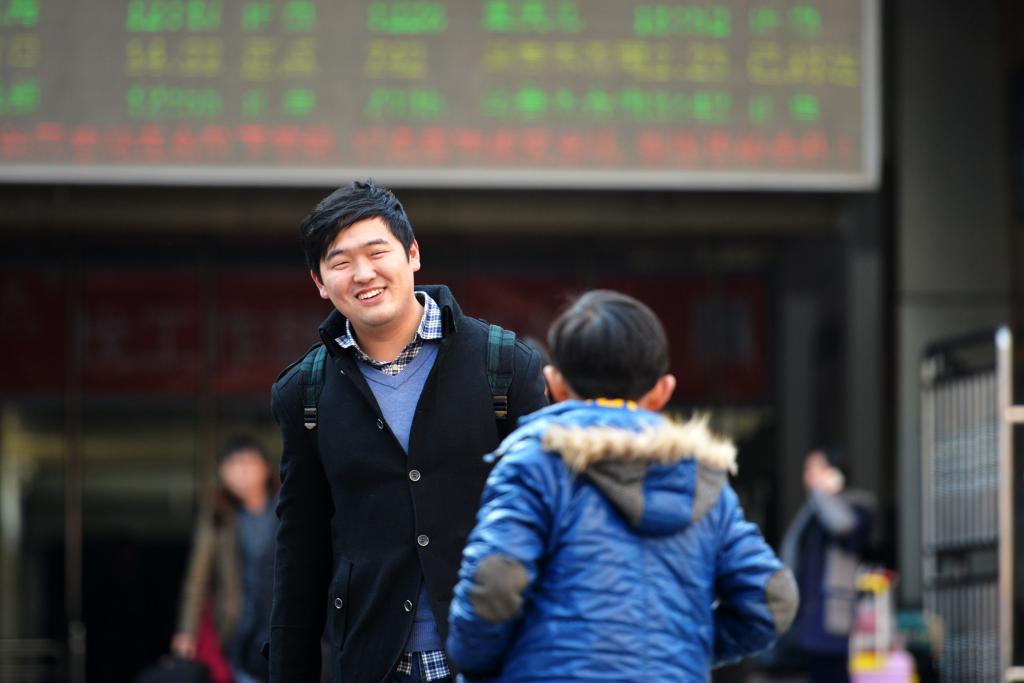 2015年2月18日,在兰州火车站,一名到达旅客见到孩子后露出笑容。新华社记者 陈斌 摄