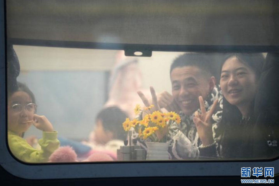 在哈尔滨火车站,旅客在列车上向窗外比手势。新华社记者 王建威 摄