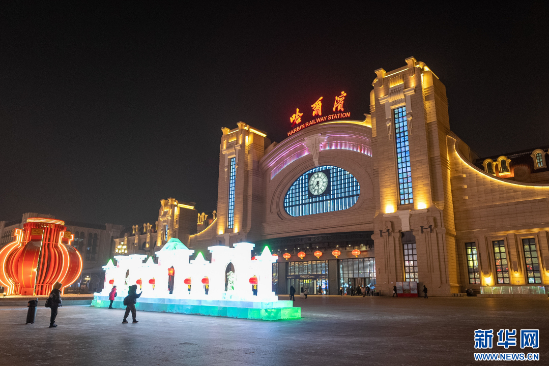 旅客在哈尔滨站站前广场上的冰雪景观旁留影。新华社记者 谢剑飞 摄