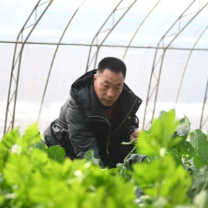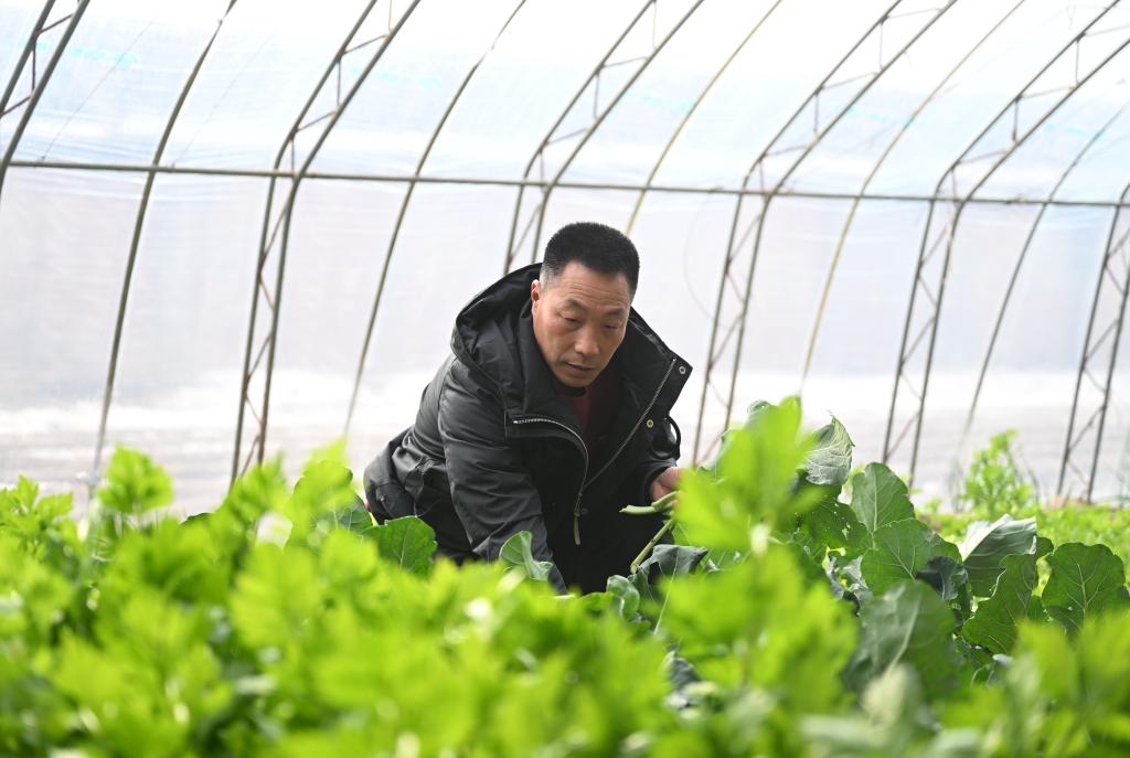 2024年2月1日,在西青区辛口镇第六埠村,菜农郝健在蔬菜大棚内劳作。新华社记者赵子硕 摄