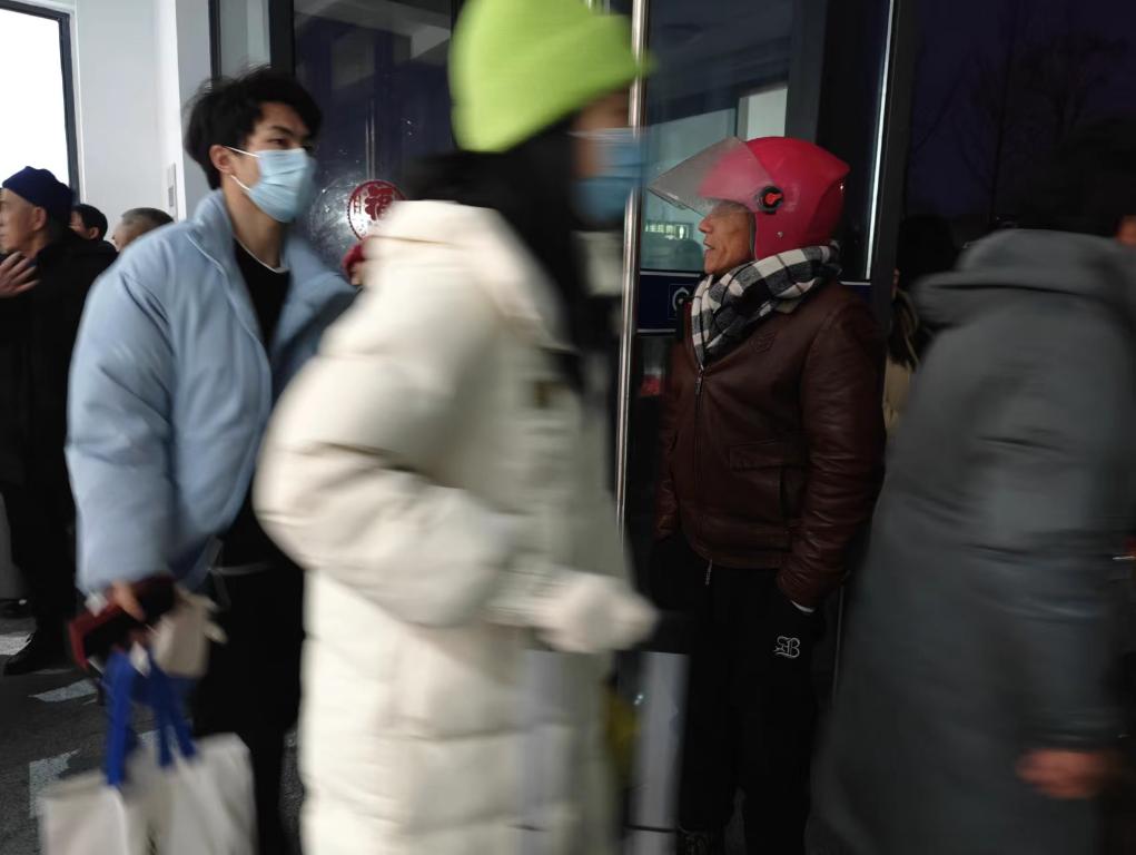 老卢(右二)在车站门口等待到站的女儿。新华社记者 陈诺 摄