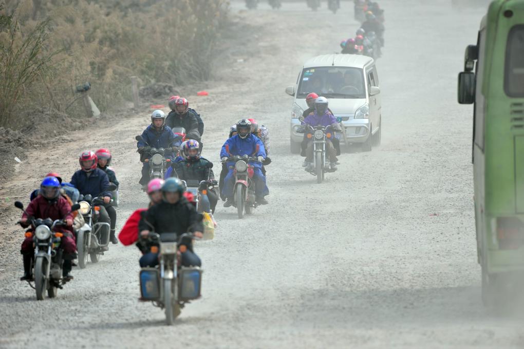 2013年2月3日,周克兵带着家人,随“摩托大军”骑行在广西藤县境内。
