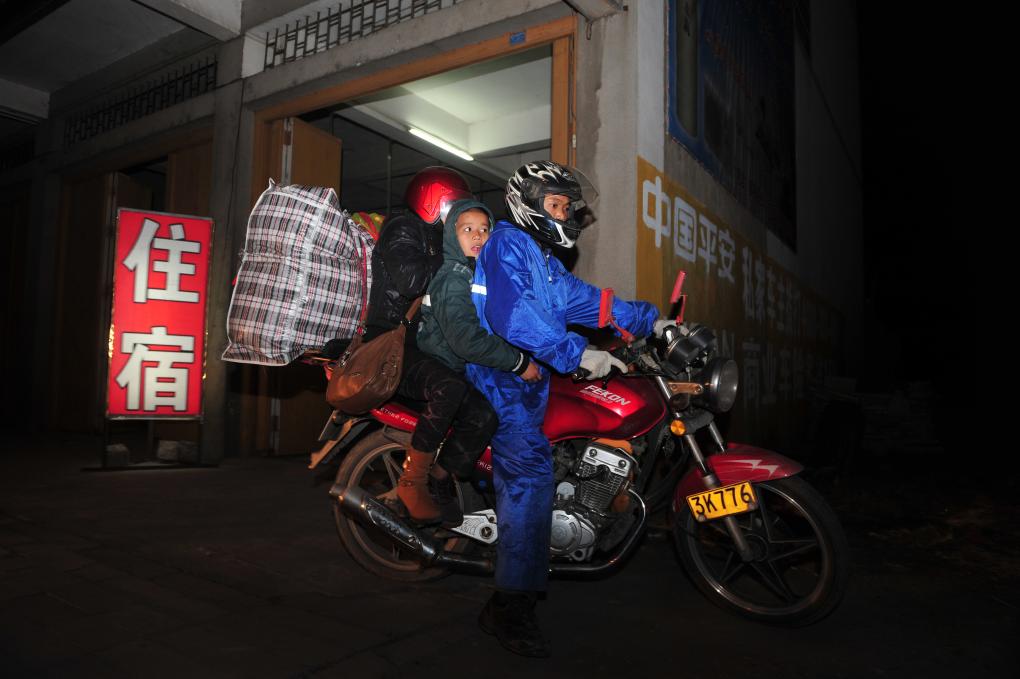 2013年2月3日,在广西藤县,短暂休息后,周克兵带着家人准备继续骑行返乡。