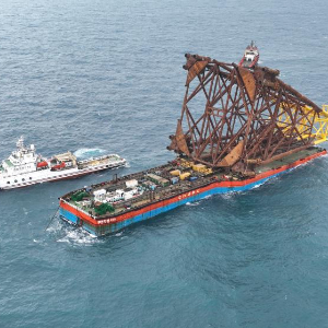 搭乘驳船的“深海一号”二期工程导管架。新华社发