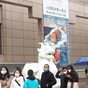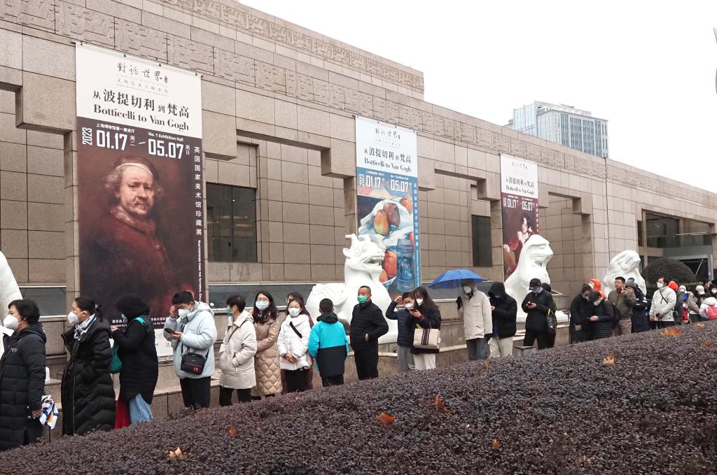 2023年1月22日,农历正月初一,观众在上海博物馆门外排队等候入馆参观。