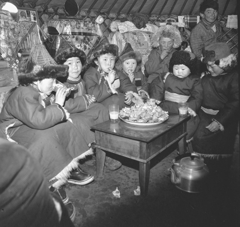 按照蒙古族习俗,年初一儿童间互相拜年,家长们都以丰盛的食品热情款待他们。这是1982年春节期间,蒙古族牧民拜年场景。