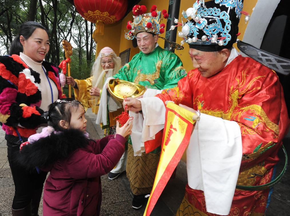 2018年2月16日,农历正月初一,在江苏苏州虎丘山景区,民俗艺人装扮成福禄寿三星为游客送上新春祝福。