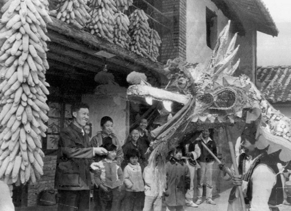 1992年新春佳节,昆明郊区杨港村村民扎起龙灯,挨家挨户给乡亲们拜年,全村一派欢乐景象。