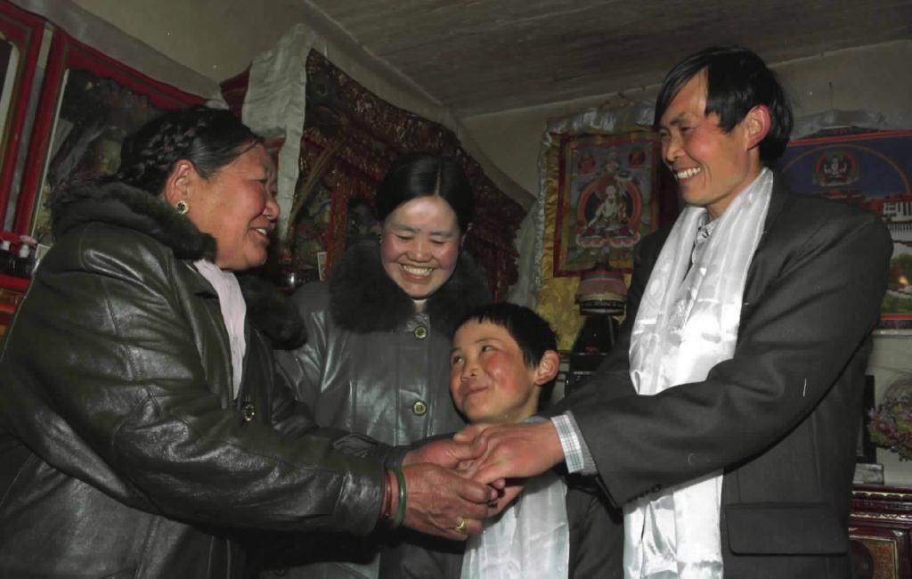 2001年1月24日,农历正月初一,藏族老阿妈卓玛(左一)向她的汉族邻居石富一(右一)一家拜年,祝贺新春佳节。