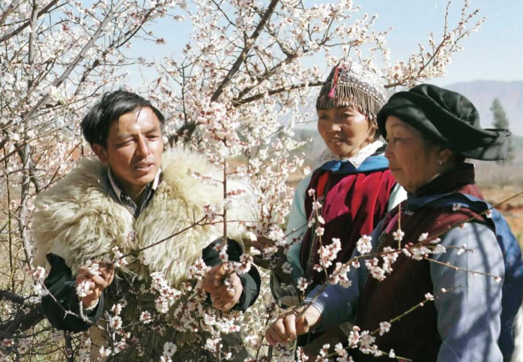 2001年春节前夕,云南省大理白族自治州的农、林科技人员开展“科技拜年”活动。这是农科员(左)在洱源县大松甸村给彝族农民介绍新梅的管理知识。
