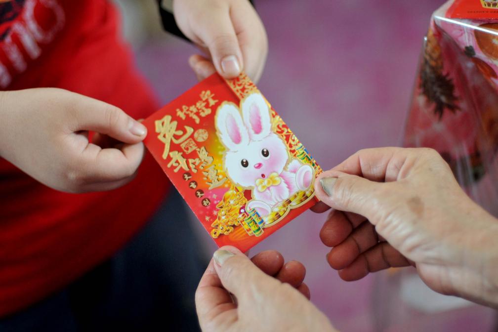 2011年2月3日,农历正月初一,在马来西亚柔佛州巴罗小镇,当地华人华侨按照传统习俗,一名长辈给小辈新年压岁钱,共庆农历年新春。