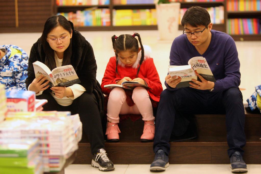 2017年1月28日,农历正月初一,人们纷纷走出家门,通过各式各样的活动快乐过大年。这是一家三口在山东省烟台市新华书店阅览图书。