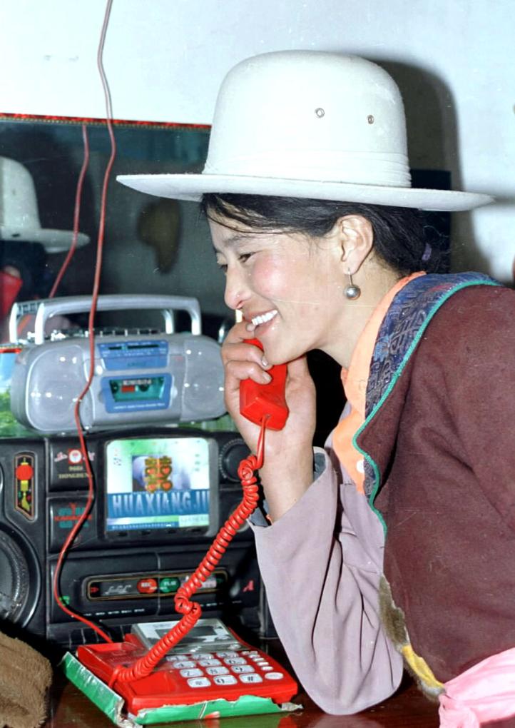 2002年春节期间,青海省海北藏族自治州刚察县年乃索麻村一位牧民用刚刚安装的无线接入电话给远在西宁的亲人拜年。