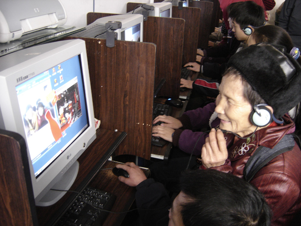 2006年1月31日,在湖南省怀化沅陵县七甲坪镇一网吧,一位土家族老人与在外打工不能回家过年的儿子、儿媳通过互联网相互问候。