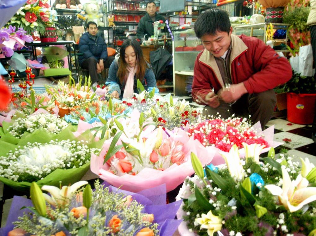 2005年2月7日,江苏苏州市公园路上一家鲜花店员工正在插花。春节前,苏州鲜花销售十分火爆。