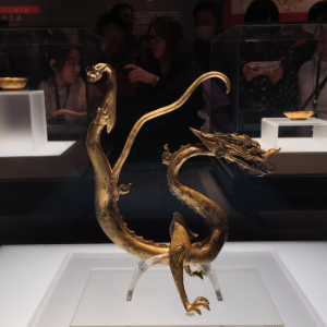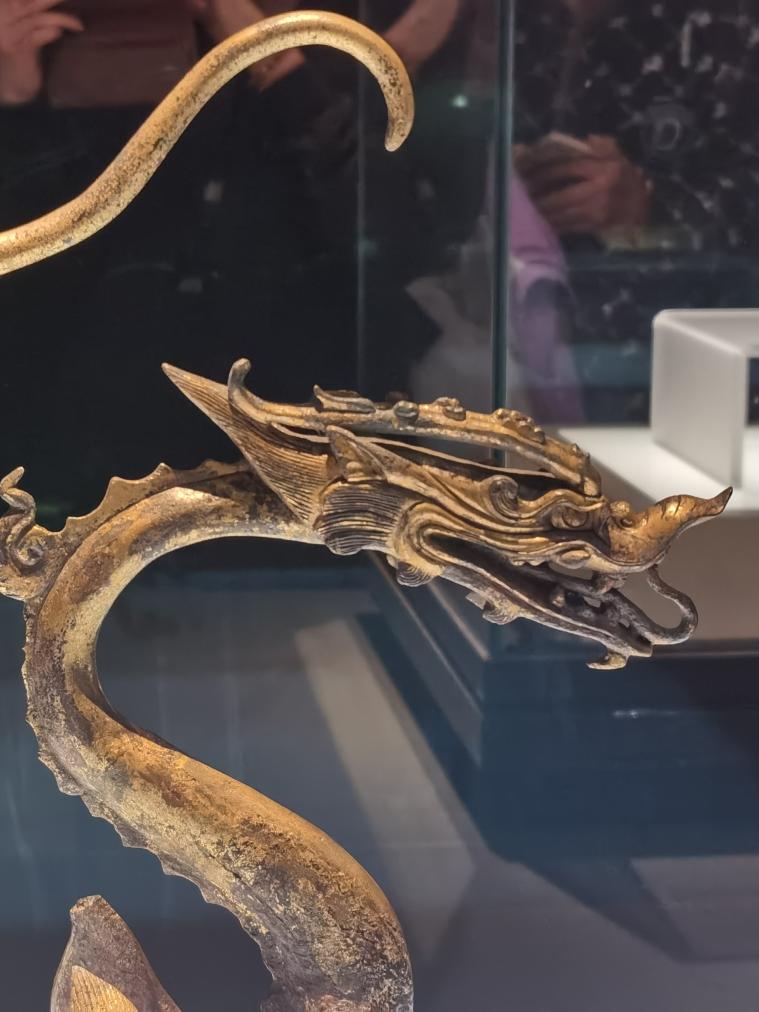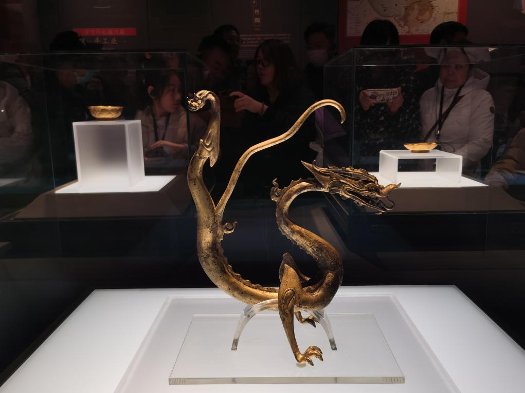 “鎏金铁芯铜龙1975年出土于西安市南郊草场坡,铁为骨、铜为筋、金为皮。” 陕西历史博物馆讲解员徐大卫说,“这件文物代表着唐代奔放张扬的美学风格和高超精湛的工艺水平。”