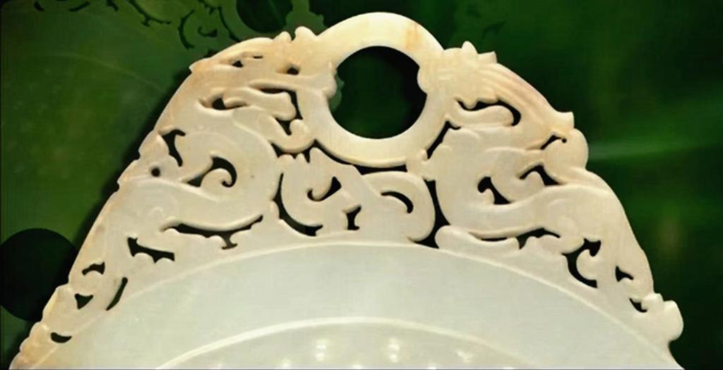 在这枚谷纹璧的上璧正中出廓位置,透雕有龙螭衔环纹。螭是传说中没有角的龙。一龙一螭在云雾中穿行,中央顶端雕出一个圆形穿孔,孔两侧有翻云覆雨的龙和螭一起衔住圆环。圆环寓意圆圆满满、吉祥如意,而龙螭昂首挺胸,表现出刚健遒劲、勇往直前的气势。
