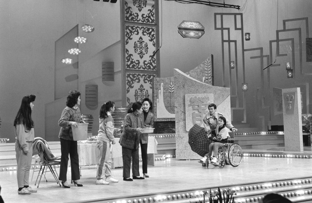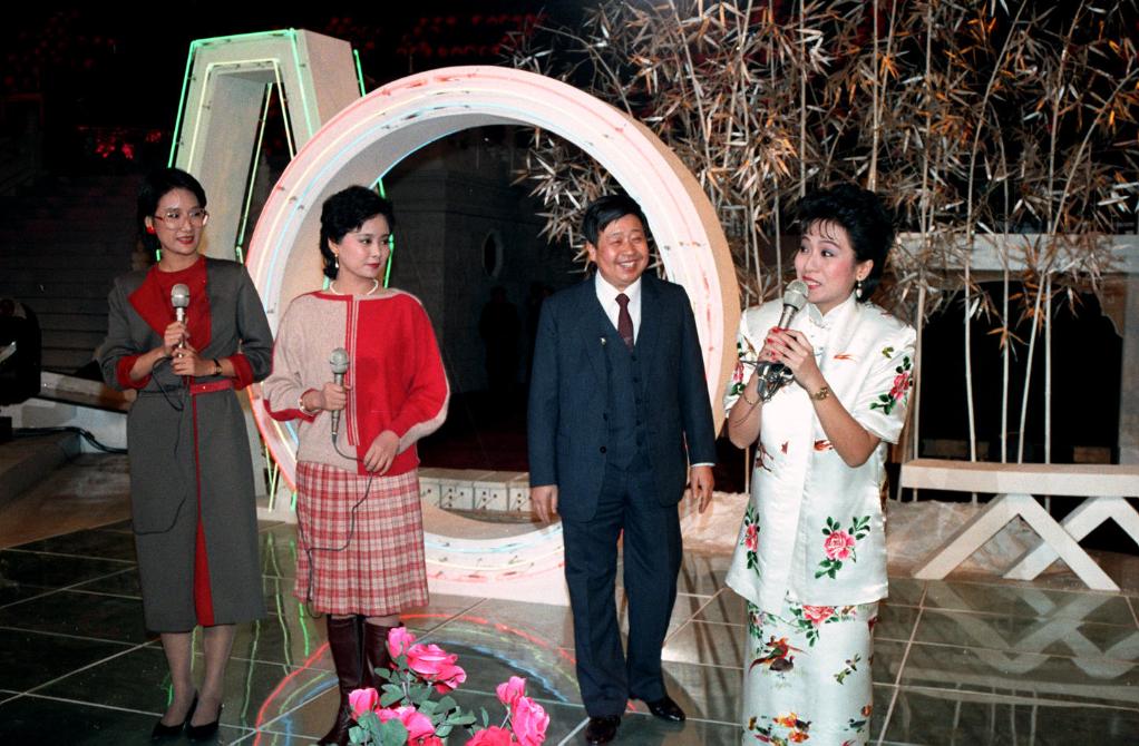 影视明星斑斑、相声演员马季、电影演员张瑜、影视明星朱宛宜(自右至左)应中央电视台邀请,在北京工人体育馆主持1985年春节联欢晚会。