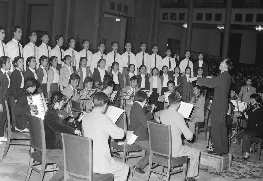 1964年2月10日晚,在首都的归国华侨聚会北京人民大会堂,举行春节联欢晚会。图为华侨大学文艺系学生在晚会上合唱《我们走在大路上》。