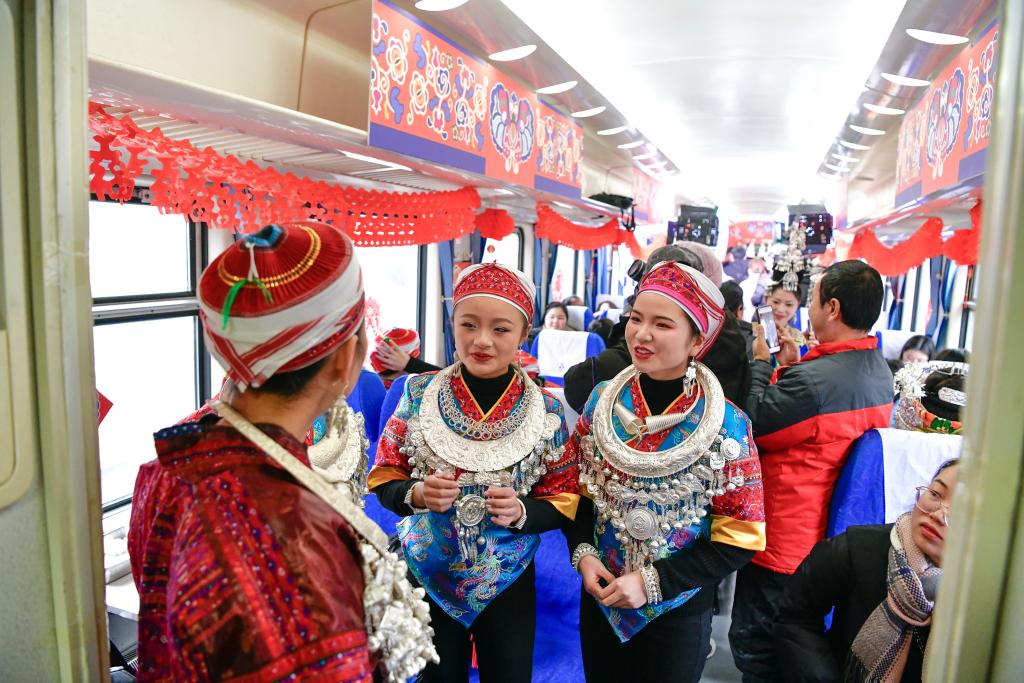 2024年1月26日,2024年全国“村晚”示范展示活动在沪昆铁路5640次列车上举办。活动以车厢为移动舞台,串联起途经的站点和村寨,向全国观众展现喜庆祥和的苗乡侗寨新画卷。