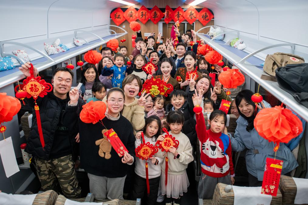 2024年2月9日,乘客和乘务组在D38次列车上合影。当日是除夕,武汉客运段汉口城际动车组车间“凤舞楚天”乘务组在列车上布置灯笼、窗花,并为旅客发放“福”字、剪纸等礼物,大家一起吃饺子猜灯谜,度过了一个年味浓浓的除夕夜。