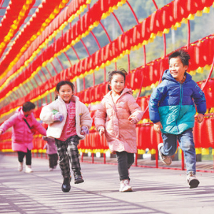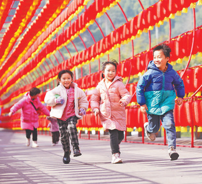 大年初一,孩子们在重庆北碚区缙云山三花石游客中心灯笼长廊游玩。秦廷富摄(新华社发)