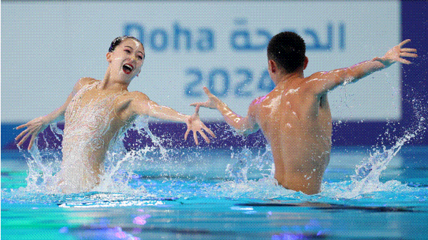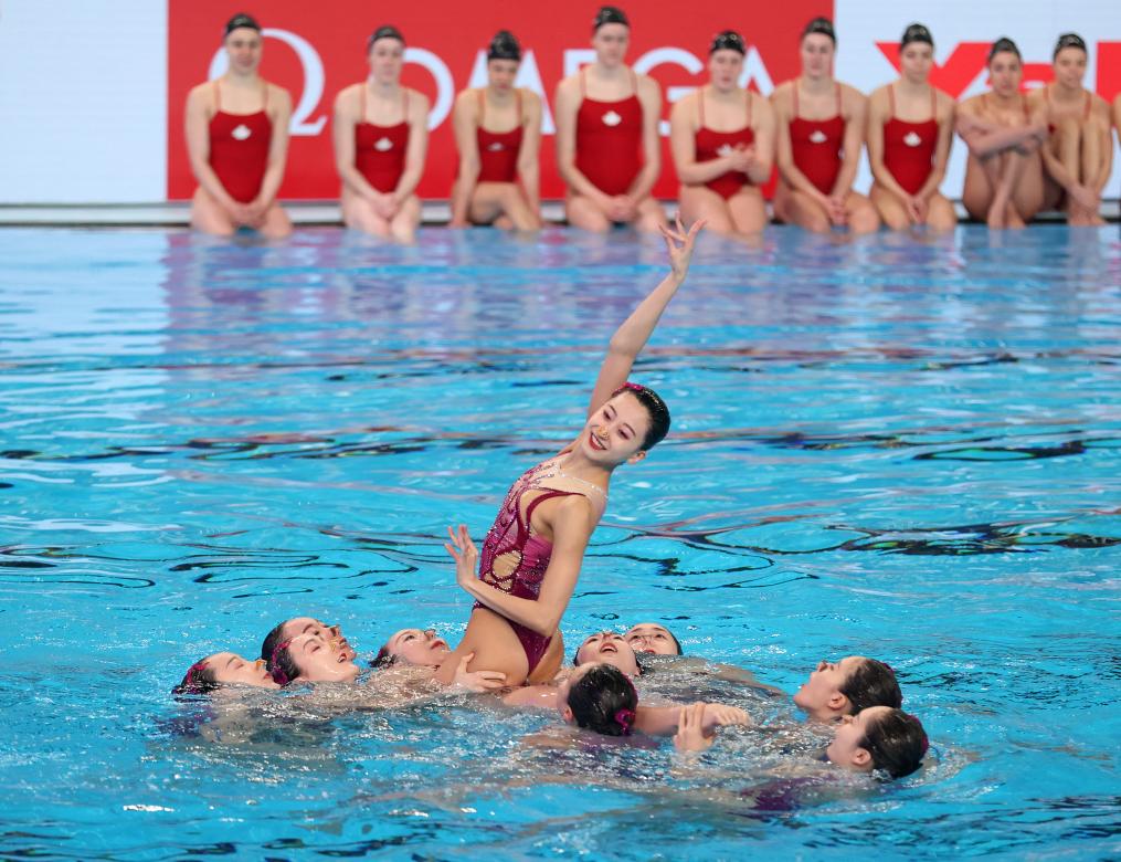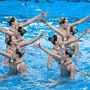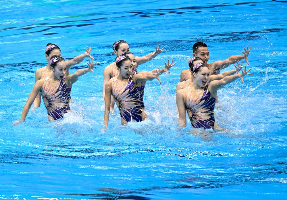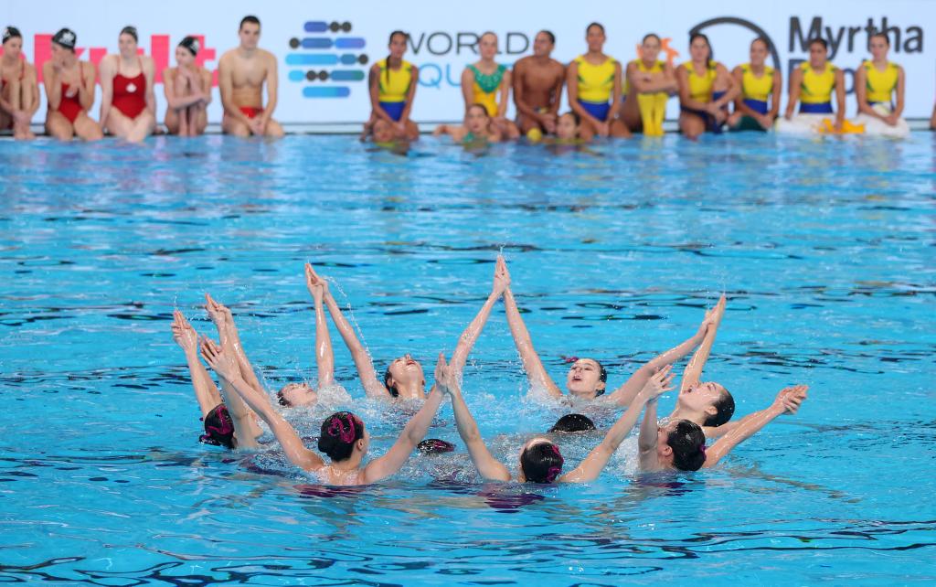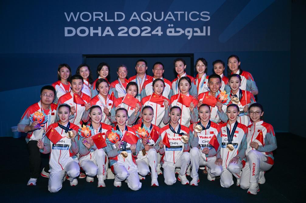 2月9日,中国花样游泳队成员在集体自由自选夺冠后合影。新华社记者 薛宇舸 摄