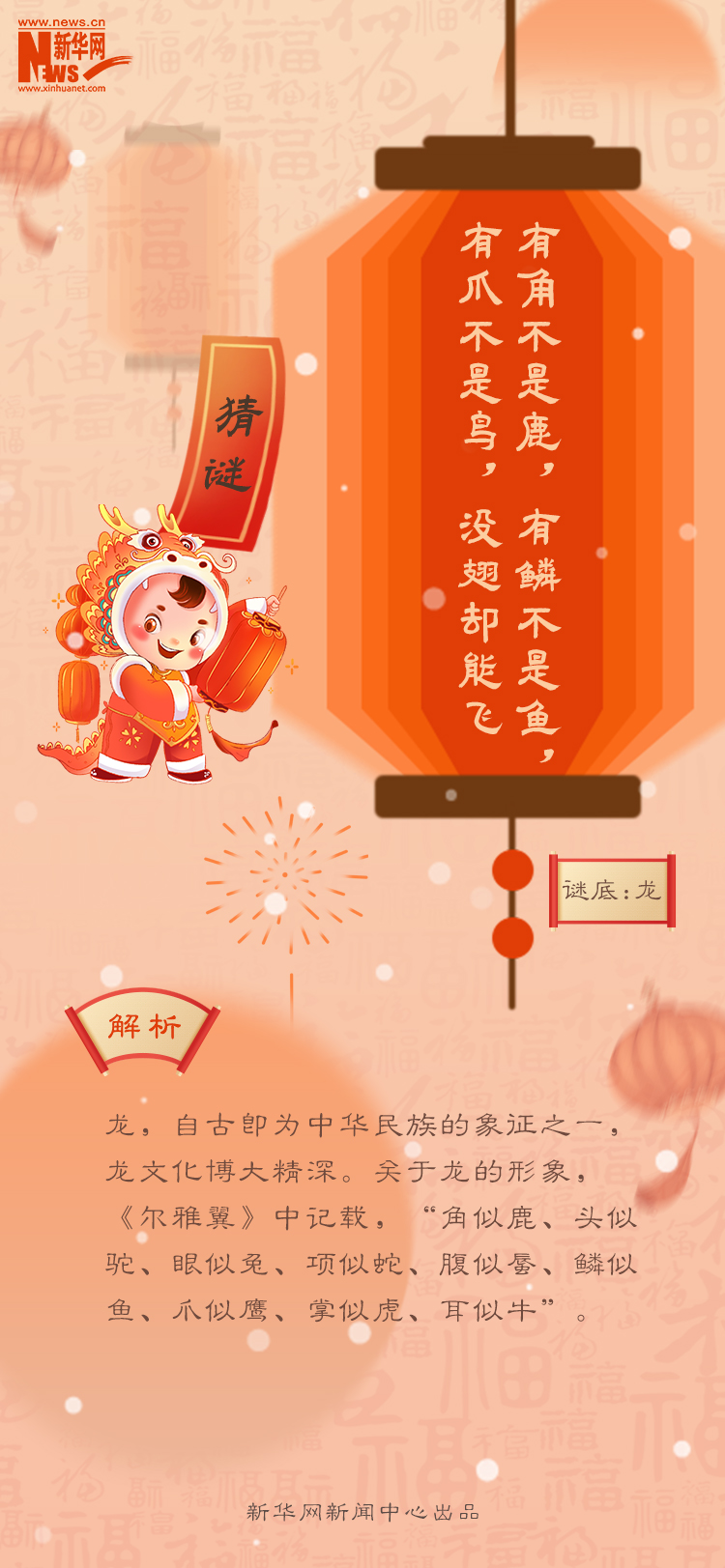 2024年是农历甲辰龙年。“龙”在中华民族心目中有着重要地位,被视为吉祥、权威和神圣的象征。在历史发展长河中,“龙”逐步汇聚起丰富的文化内涵与美好寓意,成为人们精神信仰和文化生活的重要组成部分。春节期间,《寻“龙”记》带您领略博大精深的中华“龙”文化,本期给您带来一组妙趣横生的灯谜,这组灯谜的谜面虽然各不相同,但谜底都是同一个字,一起来猜猜。