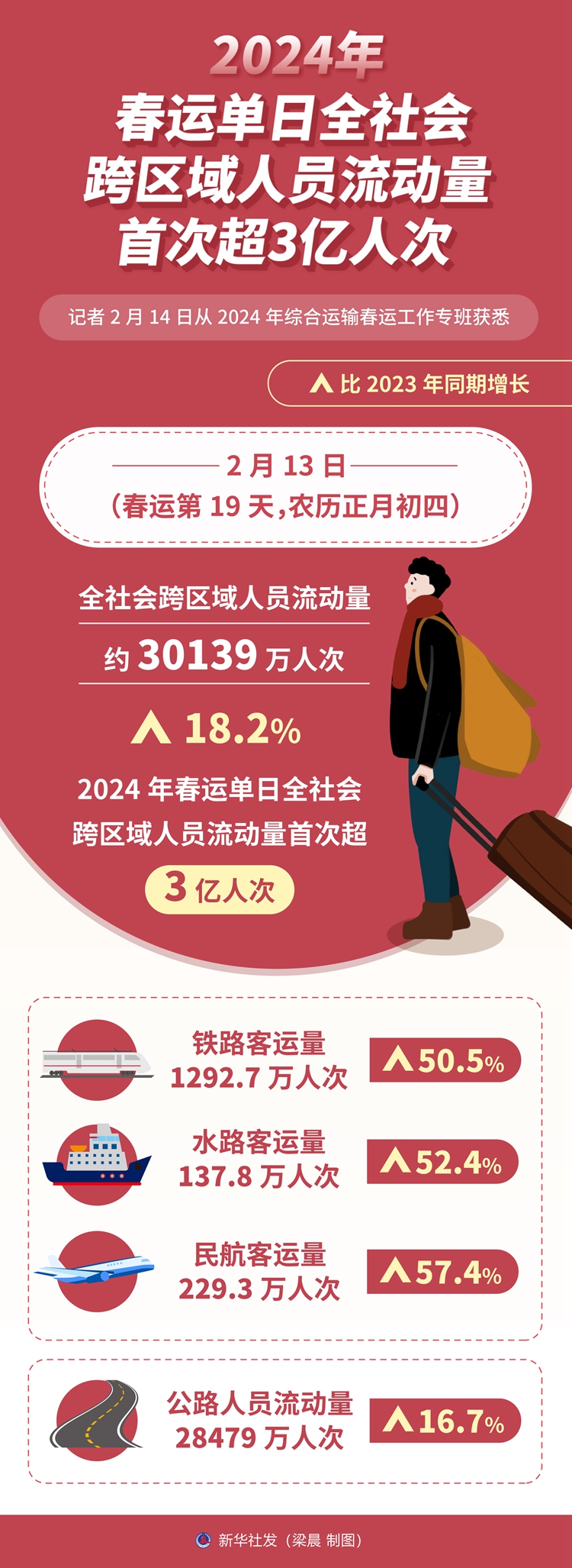 新华社北京2月14日电(记者叶昊鸣)记者14日从2024年综合运输春运工作专班获悉,2月13日(春运第19天,农历正月初四),全社会跨区域人员流动量约30139万人次,比2023年同期增长18.2%,2024年春运单日全社会跨区域人员流动量首次超3亿人次。