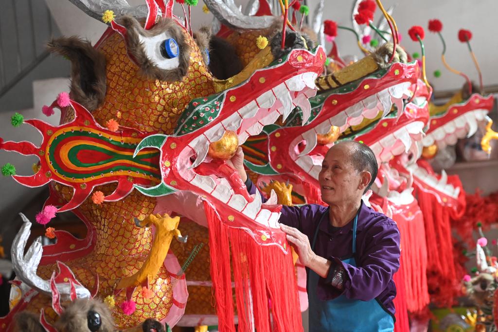 邹玉特师傅说,40多年来,他几乎每天都围着炮龙转,少一年不扎龙心里就不舒服。平时,他还到当地一些学校传授炮龙扎制技艺、传承炮龙文化。今年,为了迎接龙年炮龙节“百龙舞宾州”,邹玉特师傅几乎花了一年时间扎制了24条炮龙。