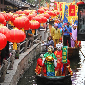 2015年2月23日是农历正月初五,“财神”在苏州水乡周庄古镇乘船巡游,为中外游客送福。