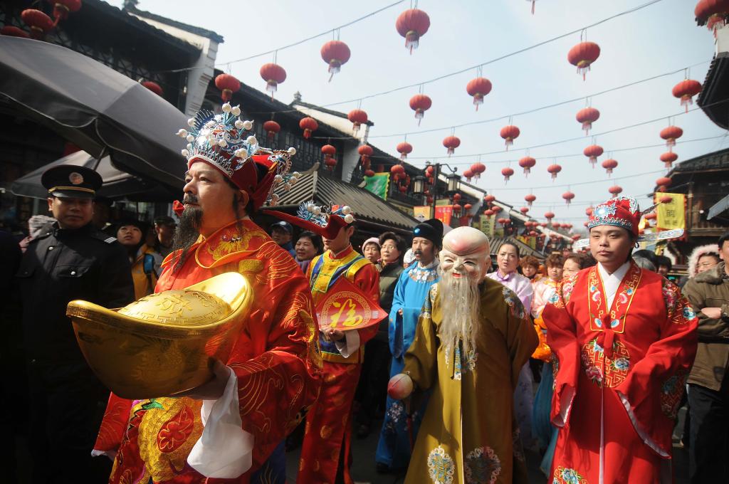 2010年2月18日是农历正月初五,由民俗演员装扮的“财神”及福、禄、寿、喜等“神仙”,在浙江杭州南宋御街行进巡演。
