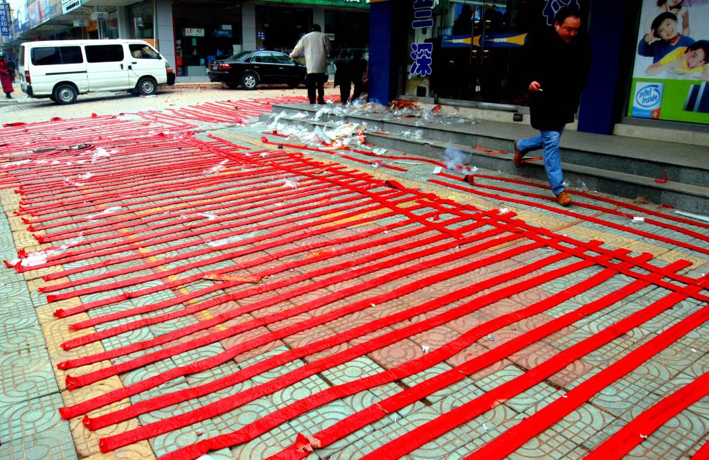 2004年1月26日大年初五,苏州一家商铺前爆竹铺满地面,以求开门大吉。