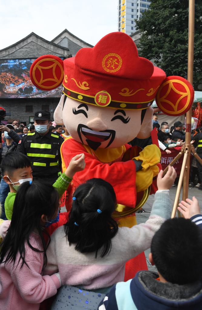 2023年1月26日是农历正月初五,在福建福州市三坊七巷,民俗巡游队伍中的“财神”和小朋友互动。
