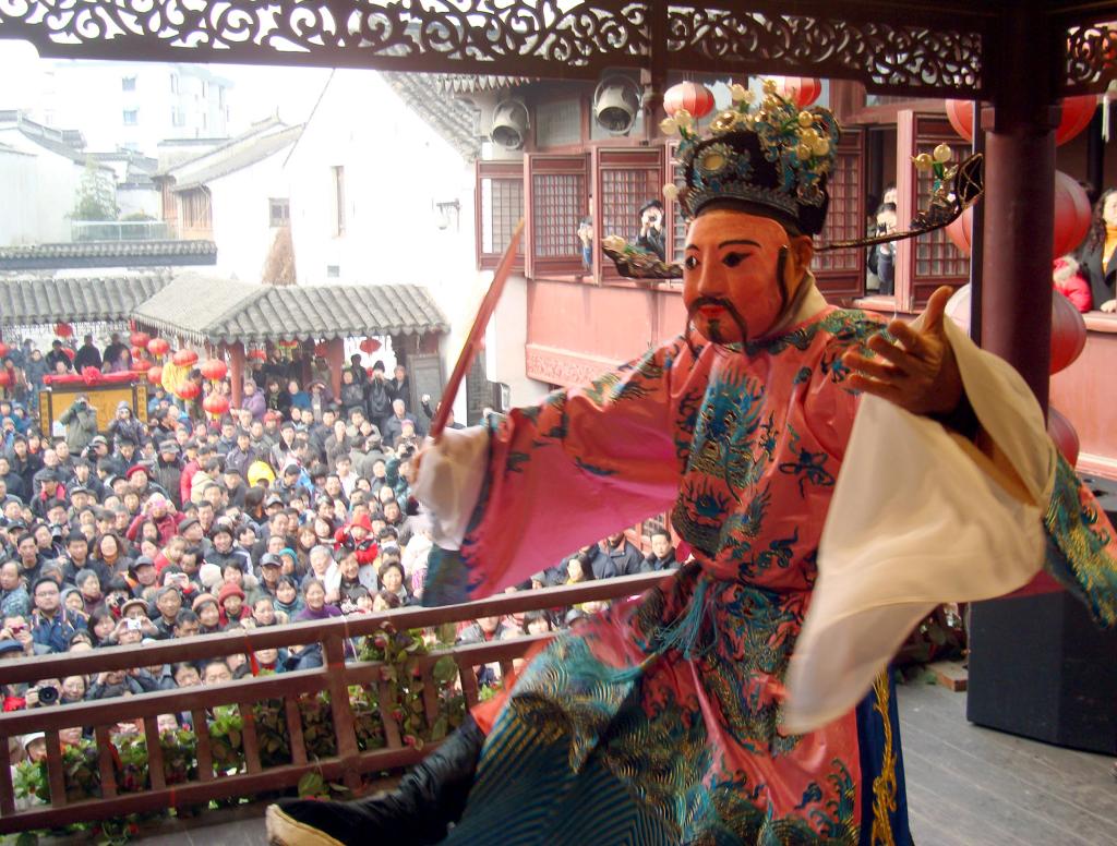 2010年2月18日是农历正月初五,由民俗演员装扮的“财神”在苏州山塘街古戏台表演。