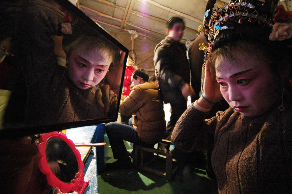 2006年春节期间,河南省沁阳市一文体活动中心中的豫剧演员们在登台表演前做准备。