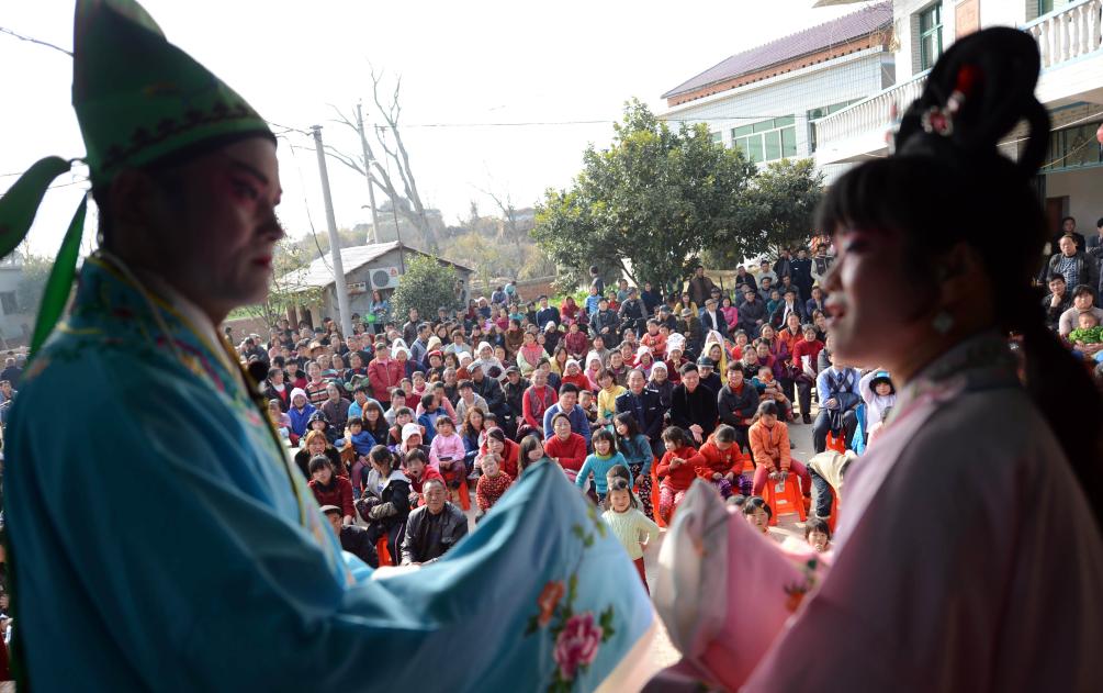 2013年春节前,江西南昌新建区文艺团队演员在昌邑乡表演节目。