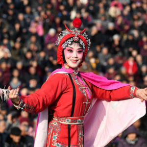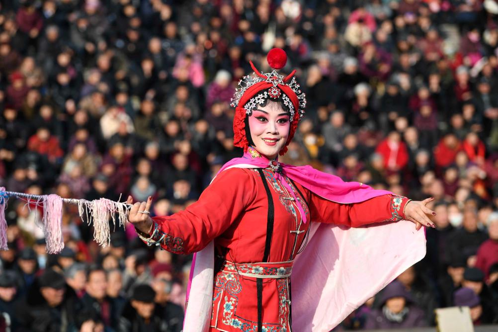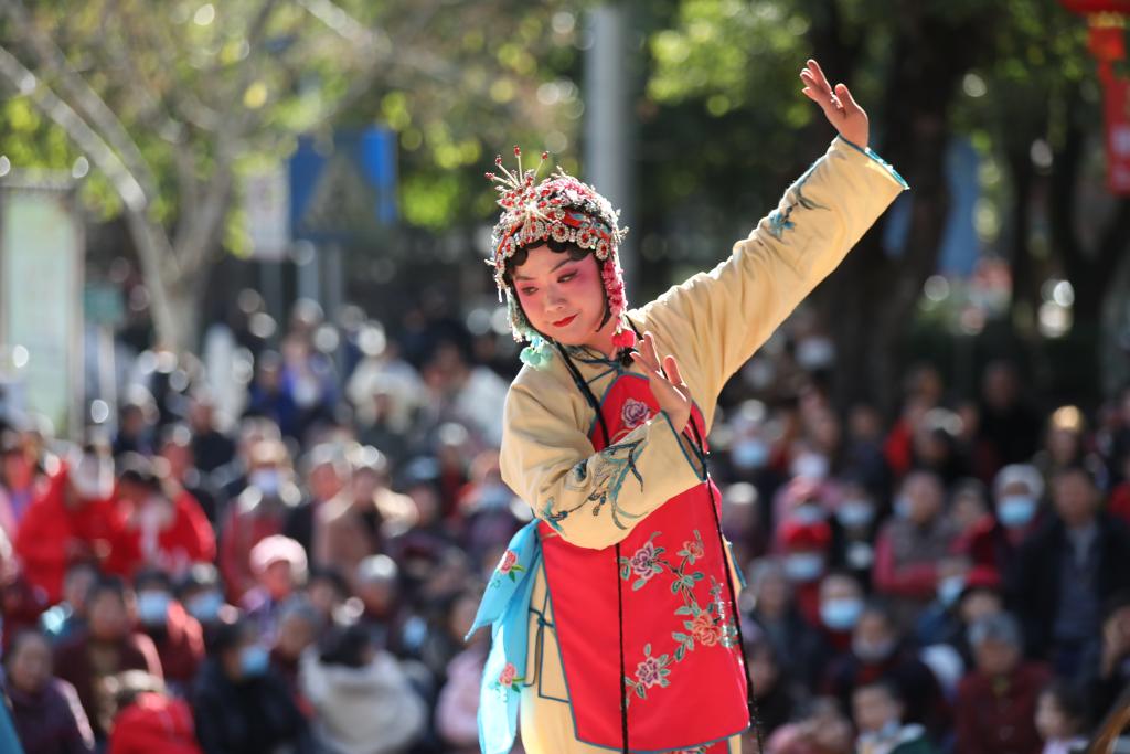 2023年春节期间,在湖南省资兴市人民广场,演员在表演花鼓戏。