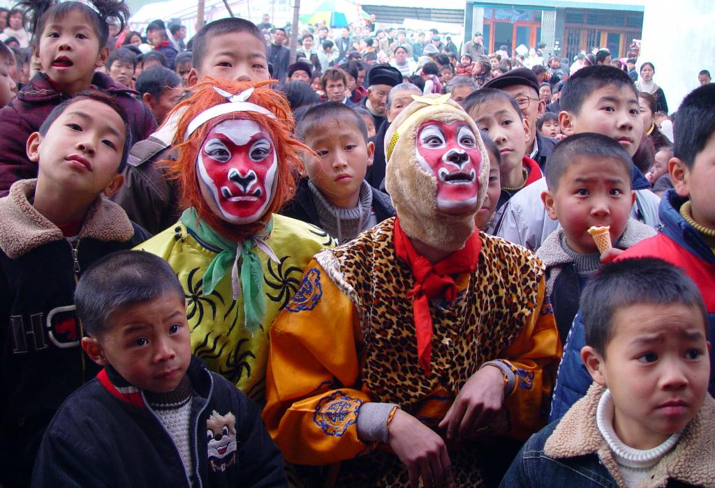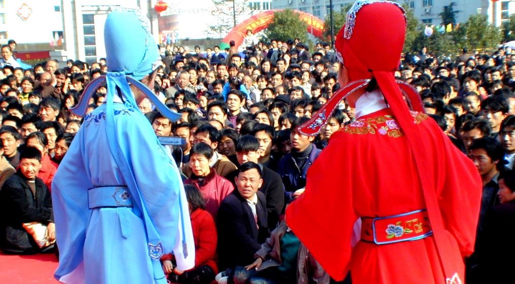 1997年春节期间,宁夏固原县一社火队在集市上表演秦腔折子戏。