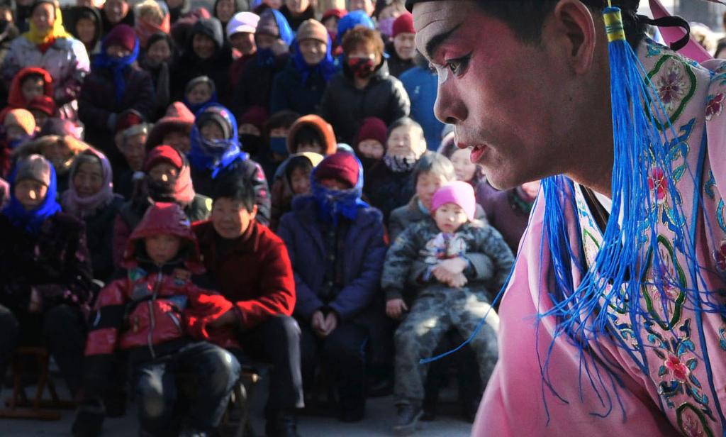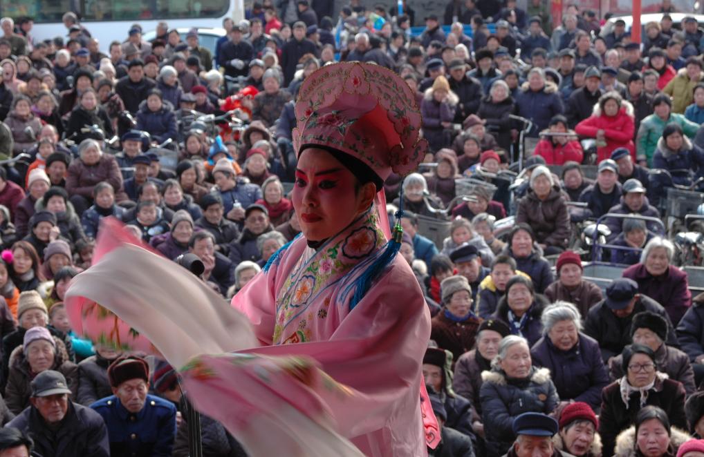 2012年元宵节后,山东省邹平县的农民演员在表演吕剧。