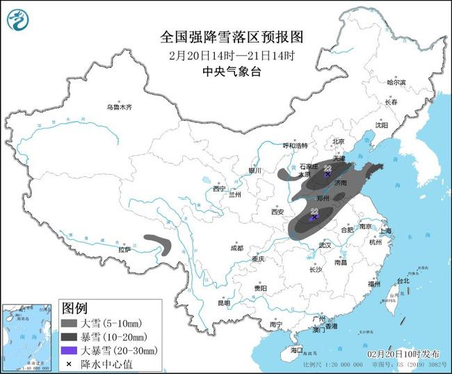 预计2月20日14时至2月21日14时,陕西北部、山西东南部、河北南部、山东、河南、安徽北部、湖北西部、西藏东部等地部分地区有大到暴雪,其中,河北南部、河南南部等地局地有大暴雪(20~22毫米)。上述部分地区新增积雪深度3~8厘米,局地可达12厘米以上。