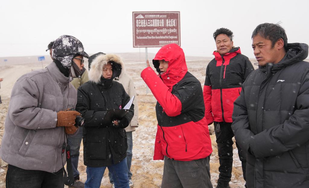 新华社记者(左二)在三江源国家公园(唐古拉山北部片区)采访。新华社记者 晋美多吉 摄