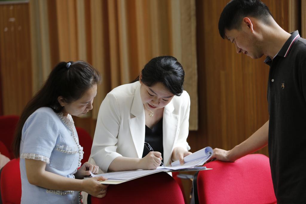 2023年5月24日,在许昌市特殊教育学校,忽晓(左)在盲童合唱团排练前与另外两位志愿者交流。