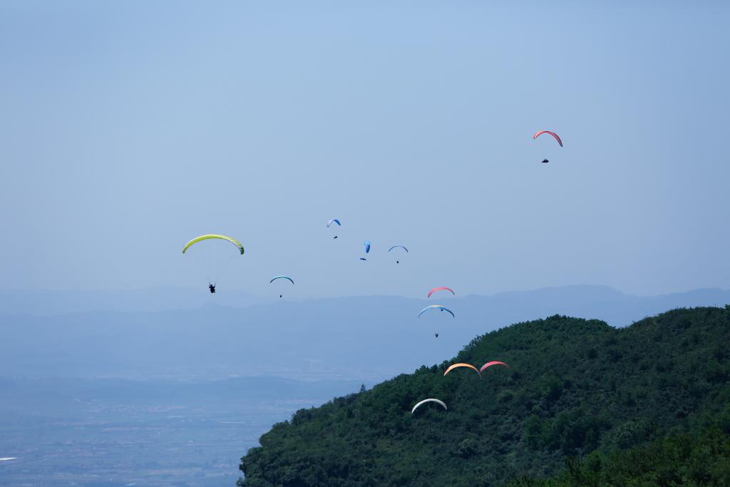 2023年6月8日,滑翔伞爱好者在河南林州市太行山区飞行。
