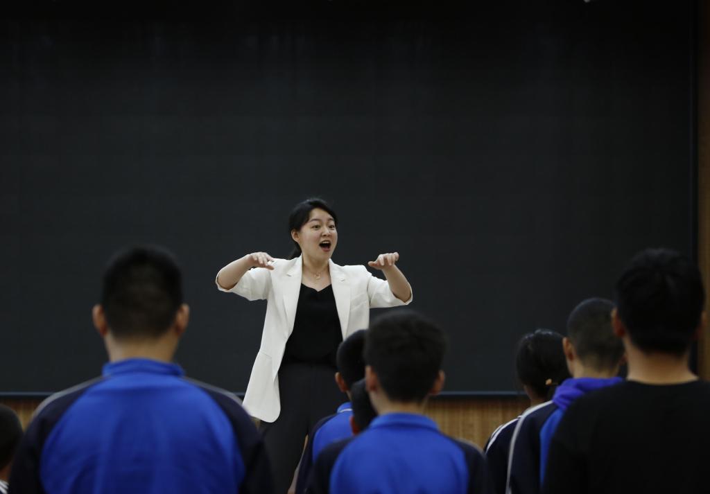 2023年5月24日,在许昌市特殊教育学校,志愿者白一童指导盲童合唱团的团员进行练习。