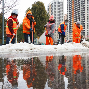 2月21日,在江苏省连云港市海州区巨龙路,环卫工人清除积雪。新华社发(耿玉和摄)